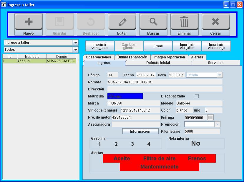 Reparaciones: Ingreso del vihículo al taller, impresión de la