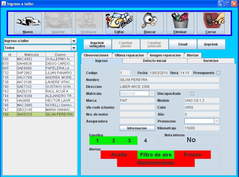 taller,listado de vehículos en taller, histórico de reparación por cliente,